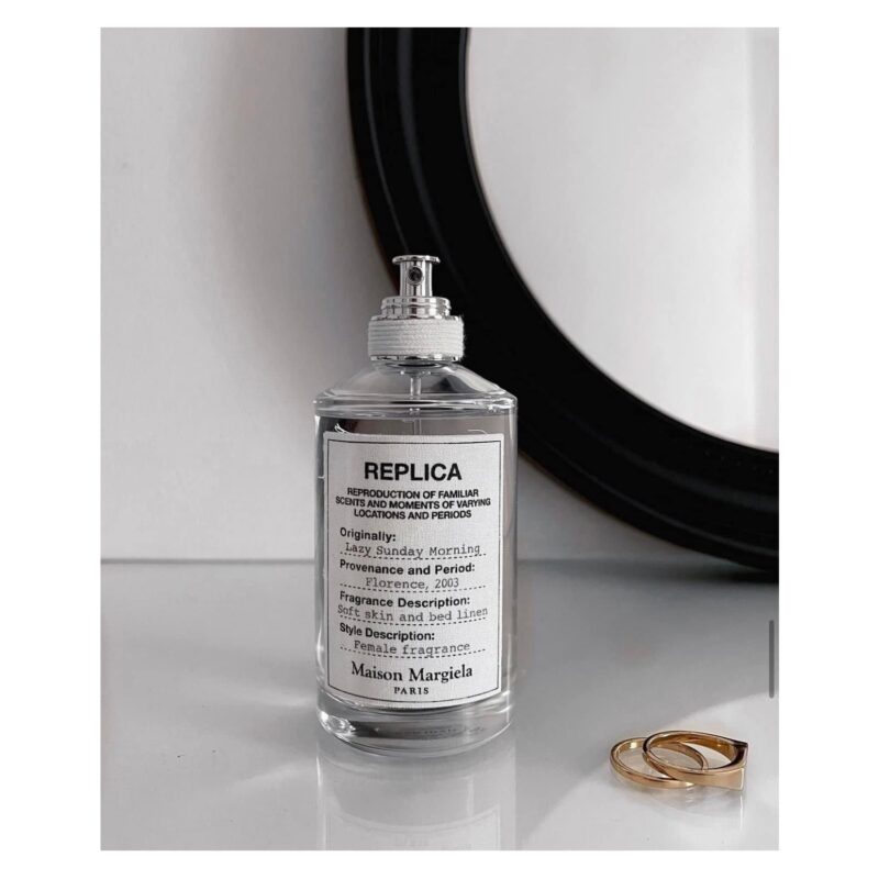 Bộ sưu tập Replica của Maison Margiela, một thương hiệu thời trang được chứng nhận Haute-Couture, có một loại nước hoa mang tên Lazy Sunday Morning. Nước hoa bản sao được thiết kế để gợi lên khoảng thời gian lãng mạn và hoài cổ. Một buổi sáng chủ nhật lười biếng, nằm sưởi nắng bên cửa sổ, ngửi thấy mùi thơm của Maison Margiela thì sẽ thế nào? Dịu dàng và rực rỡ, Aldehydes làm dịu lớp đất được gieo trồng bên dòng sông. Mịn màng như lụa, hương thơm dịu dàng và trìu mến của hoa hồng làm say lòng người hoa diên vĩ tím óng ánh như nhung. Có thể nhìn thấy xạ hương trắng cùng với Hạt giống vàng được đặt trong Bản sao Maison Margiela giúp tạo ra cảm giác ấm cúng.
